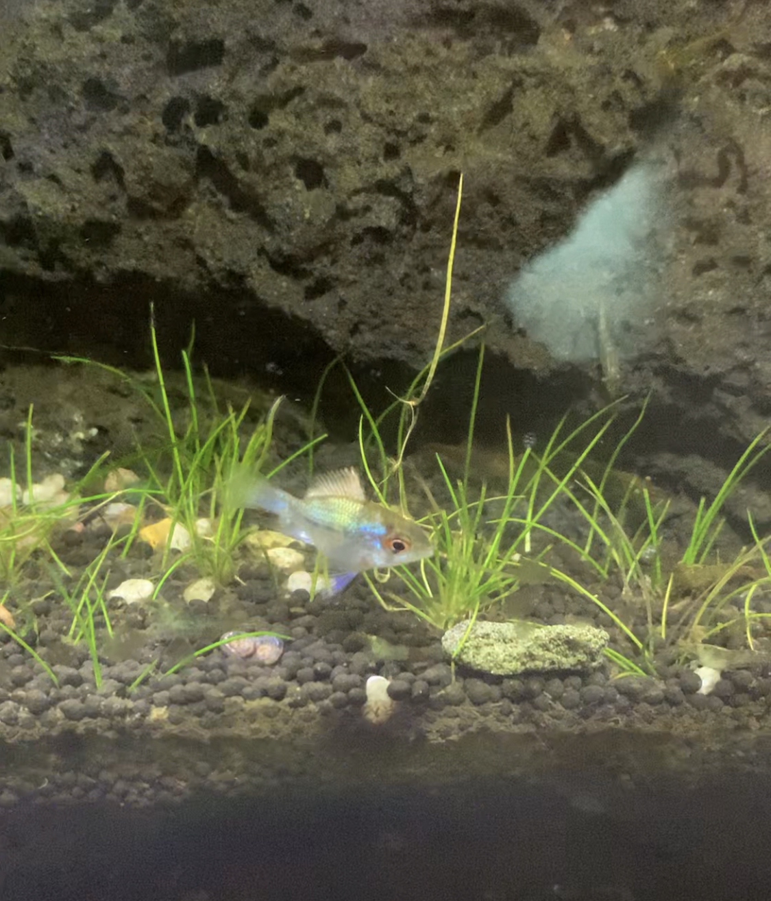 30 큐브 어항에 일렉트릭 블루 볼 라미레지 한 마리와 와 블루 볼 라미레지 두 마리를 키우게되었다.