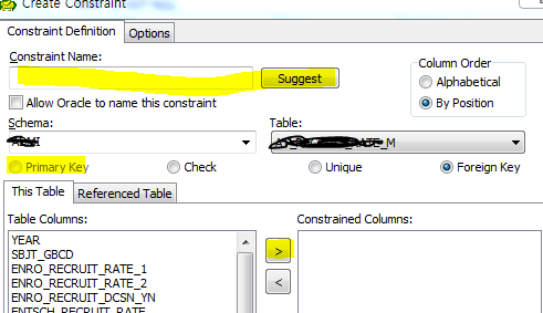 4. Primary Key 선택하고 PK 명 적고(그냥 suggest 누르면 예쁜 이름 추천해줌) PK로 사용할 컬럼 하나씩 추가해준다.
