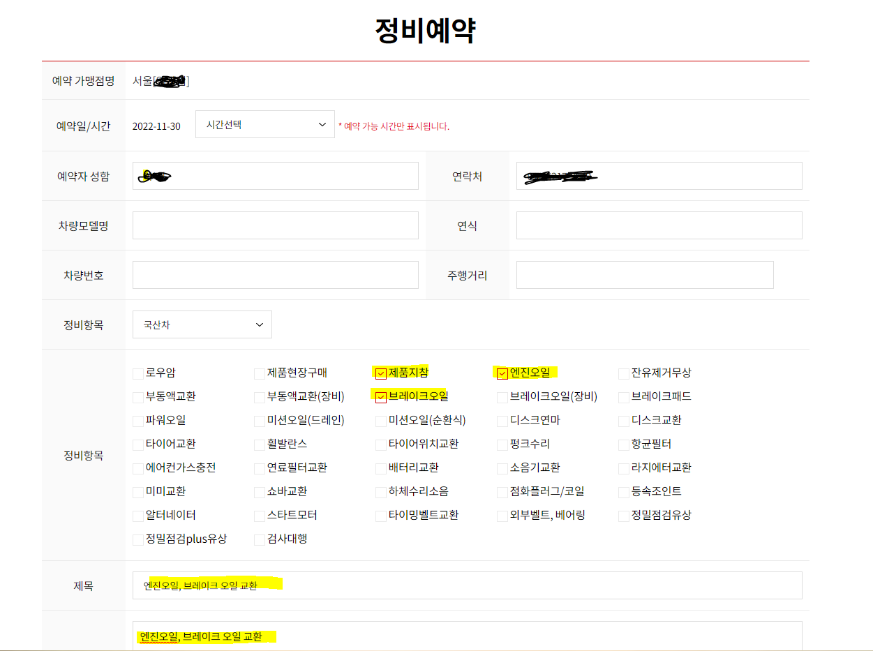 정비 항목 선택하고 제목이랑 내용 대충 넣고