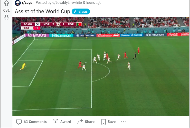 | [해외반응] 손흥민 발롱도르 11위 레딧 반응 (1) | 2022.10.18 |