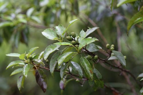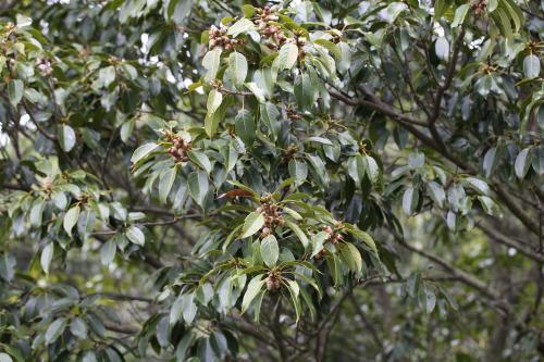 산지에 자라는 상록성 작은큰키나무로 큰 것은 8m에 이른다. 꽃차례에만 털이 있고 가지는 굵으며 회갈색 또는 흑갈색이다. 잎은 어긋나며 넓은 피침형 또는 타원형이고, 잎끝은 점차 뾰족해지고, 밑은 뾰족하다. 잎의 길이는 3~6cm, 폭은 2~3cm이다. 표면은 짙은 녹색, 뒷면은 황갈색, 양면에 털이 없고, 물결 모양의 톱니가 드물게 있으며 가죽질, 광택이 있다. 잎자루는 길이 1∼1.5cm 정도이다. 꽃은 양성으로 5월에 황색 또는 연한 녹색으로 가지 끝에 총상꽃차례로 달린다. 꽃받침통은 털이 없다. 갈래 조각은 달걀 모양, 넓으며 털이 있다. 수술은 5개의 무더기로 갈라진다. 열매는 지름 0.5~0.7cm로 긴 난형이고 가을에 검은색으로 익는다. 이 종은 노린재나무에 비해 잎은 상록성이고 꽃은 전년지 잎겨드랑이에 총상꽃차례로 달리므로 구별된다. 우리나라 제주도에 자생하며, 일본에도 분포한다.