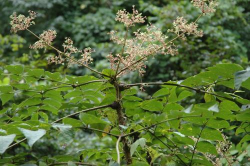 낙엽활엽 작은키나무로 줄기는 가시가 많고, 밑으로 처지며, 높이 2m쯤이다. 잎은 작은 잎 5-9장으로 된 깃꼴겹잎이다. 작은 잎은 타원형 또는 도란형으로 길이 2-4cm, 너비 1-2cm이다. 꽃은 5월에 원추꽃차례로 피며, 흰색이고, 지름 2cm쯤이다. 열매는 10월에 붉게 익는다. 울타리에 심으며, 열매는 약용하고, 어린순은 식용한다. 한국, 일본, 중국에 분포한다.