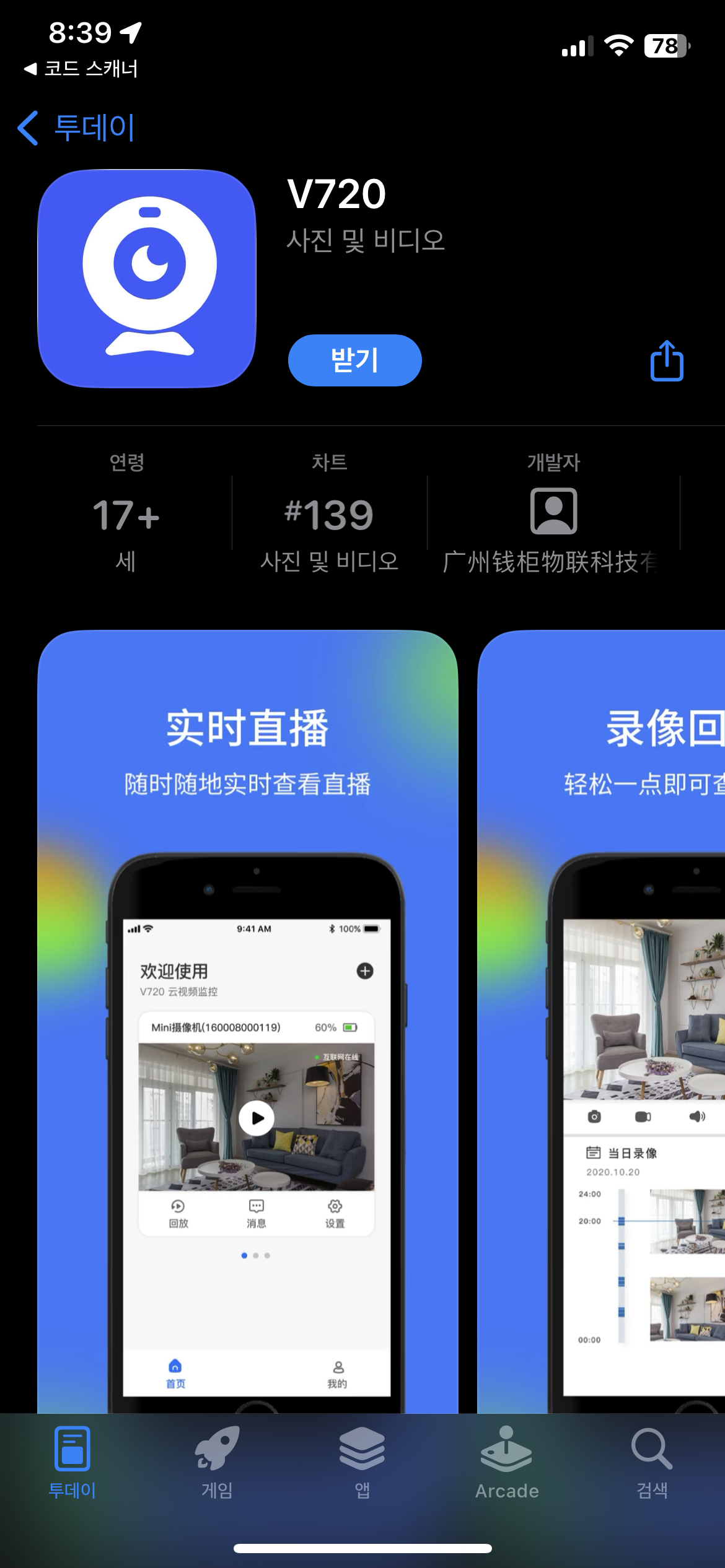 설정을 위해 V720앱을 다운로드하였다.