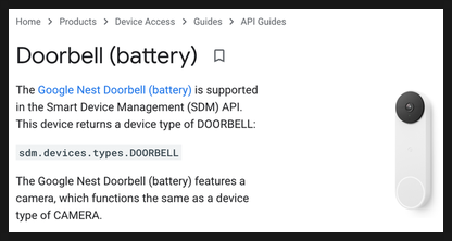 1.먼저 Google SDM API에서 Nest doorbell이 지원 되는지 확인했습니다.