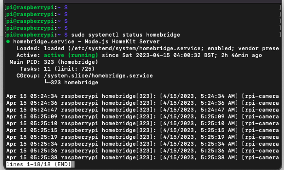sudo systemctl status homebridge마지막 status 명령어를 통해서 홈브리지가 제대로 올라왔는지 확인할 수 있다.