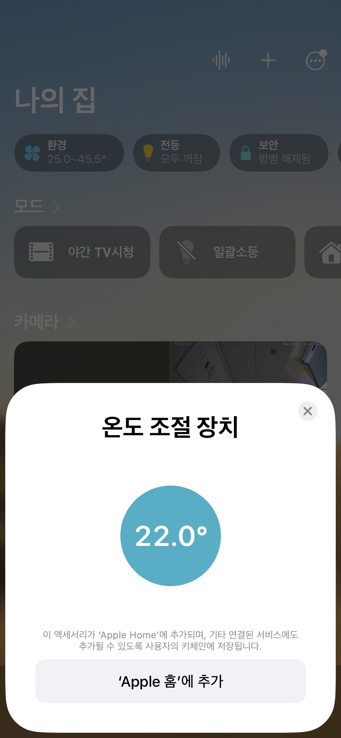 애플 홈앱을 열고 큐알코드를 인식시켜줍니다.