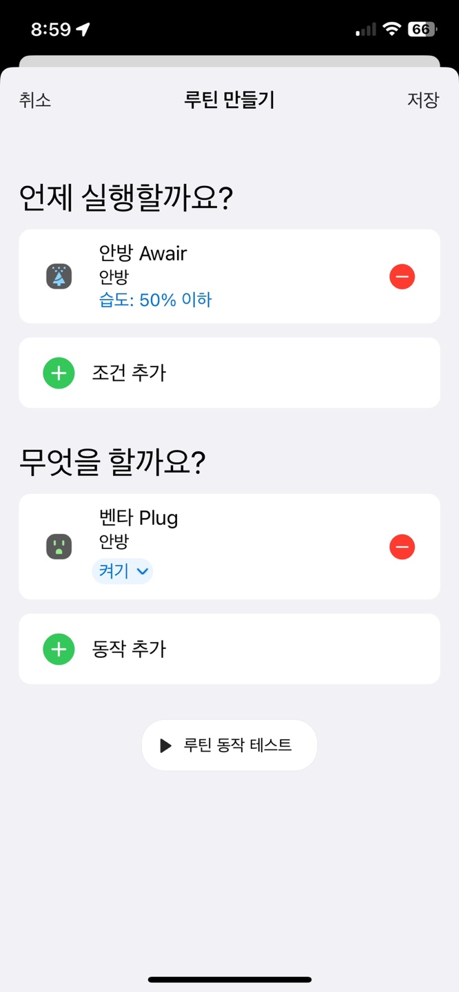 온습도 측정을 위해 '어웨어' 센서를 사용했습니다. 어웨어 센서의 습도 감지 기능을 활용하여 실내 습도가 50% 이하로 떨어지면 스마트 플러그가 자동으로 켜지게 설정했습니다. 반대로 습도가 55% 이상으로 오르면 스마트 플러그가 꺼지게끔 설정하여 가습기의 작동을 자동으로 조절할 수 있도록 했습니다.