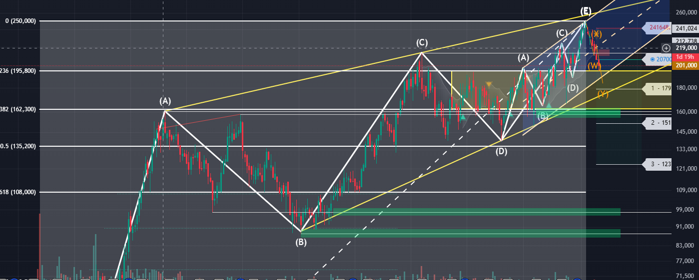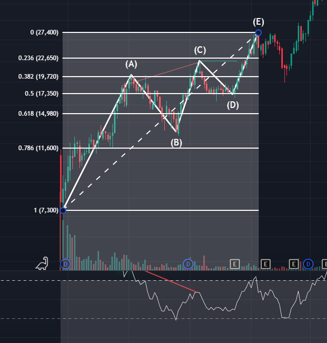 내가 본 차트가 맞다면 전체 진행 파동의 0.5에서 0.618을 되돌려야 한다.