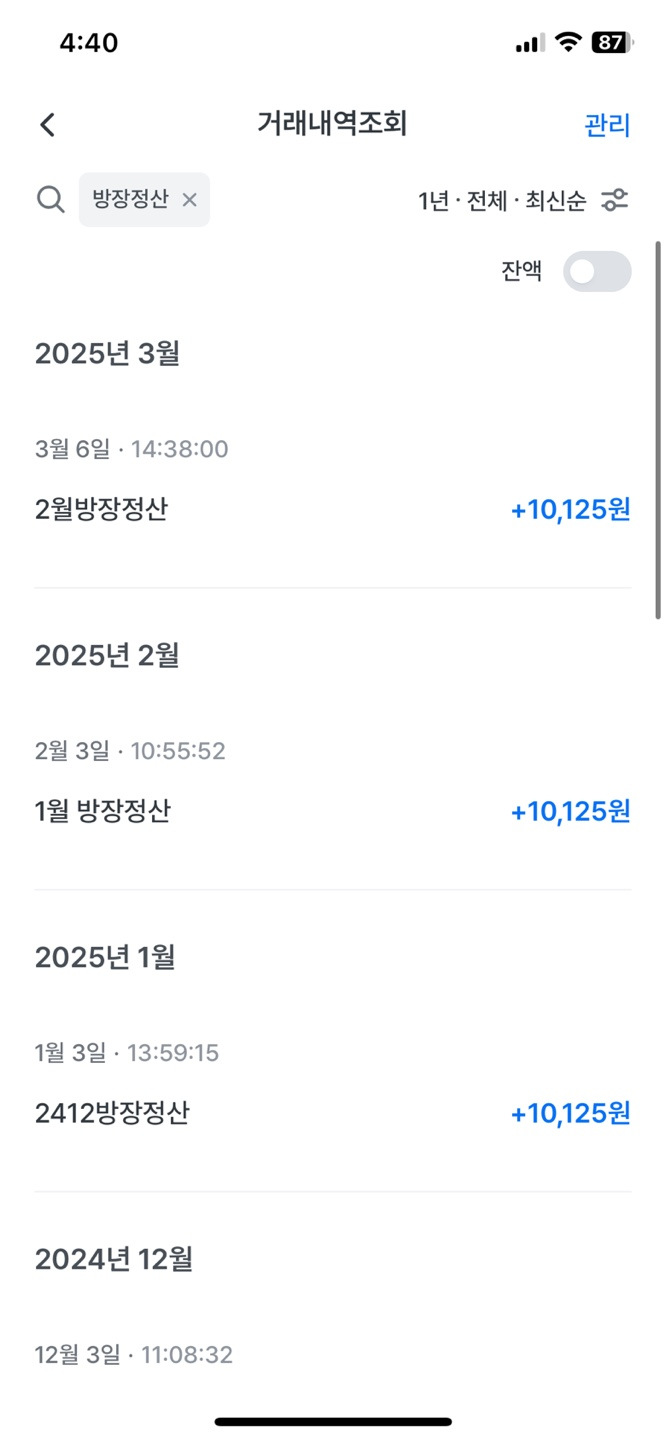 아래처럼 매월 정산되어 통장에 돈이 들어옵니다.