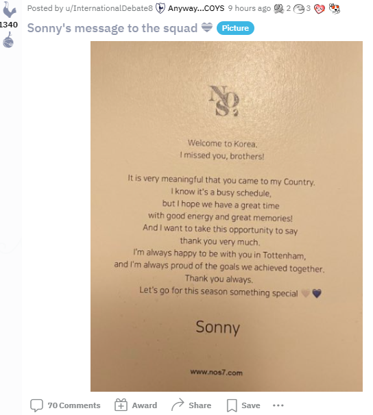 프리시즌 일정으로 토트넘 선수단이 한국에 입국했습니다. 손흥민은 공항까지 마중도 나왔고 레비 단장, 콘테 감독, 케인, 요리스, 다이어 등 절친들에게 뜨거운 포옹과 함께 반가움을 표했습니다. 뿐만 아니라 손흥민은 동료들이 묵는 호텔 방마다 웰컴 선물과 함께 편지를 넣어두었습니다. 이에 대한 레딧 반응 모아봤습니다.
